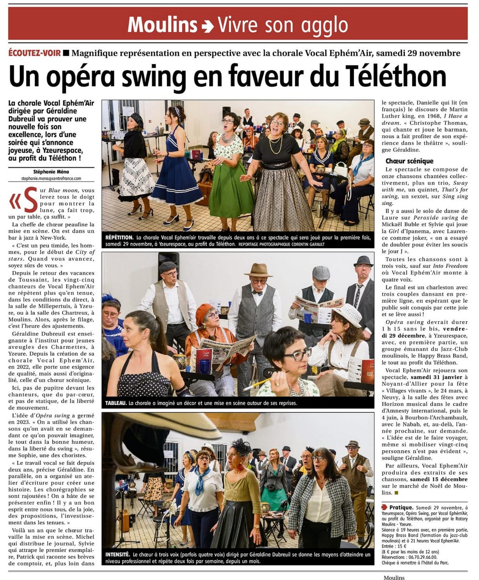 Offrez à votre public une expérience vocale hors norme. VocalEphém'air est un chœur scénique moulinois (03) original porté par 25 choristes à l'énergie débordante. Entre élégance classique et déhanchés swing, ce spectacle d'1h20 séduit toutes les générations par sa mise en scène dynamique et sa proximité avec le public. Une parenthèse enchantée, rythmée et résolument joyeuse.