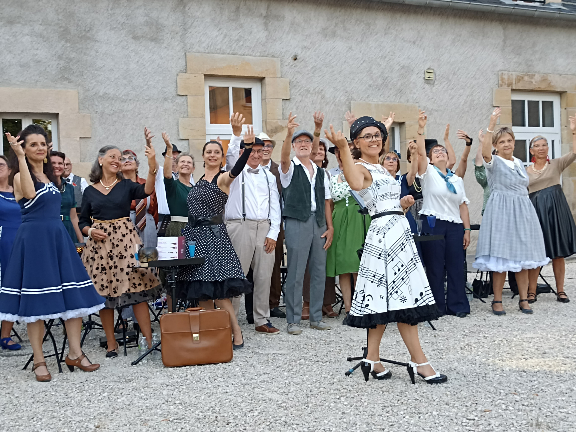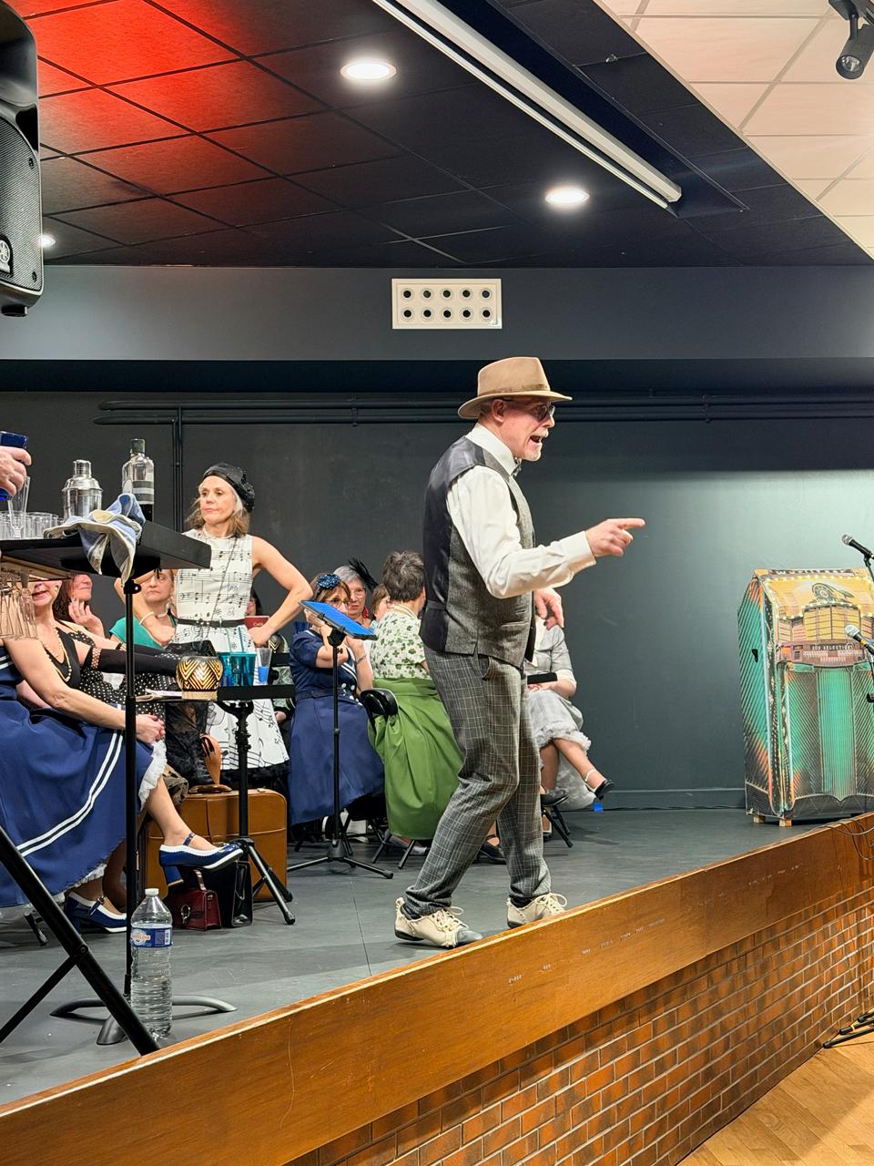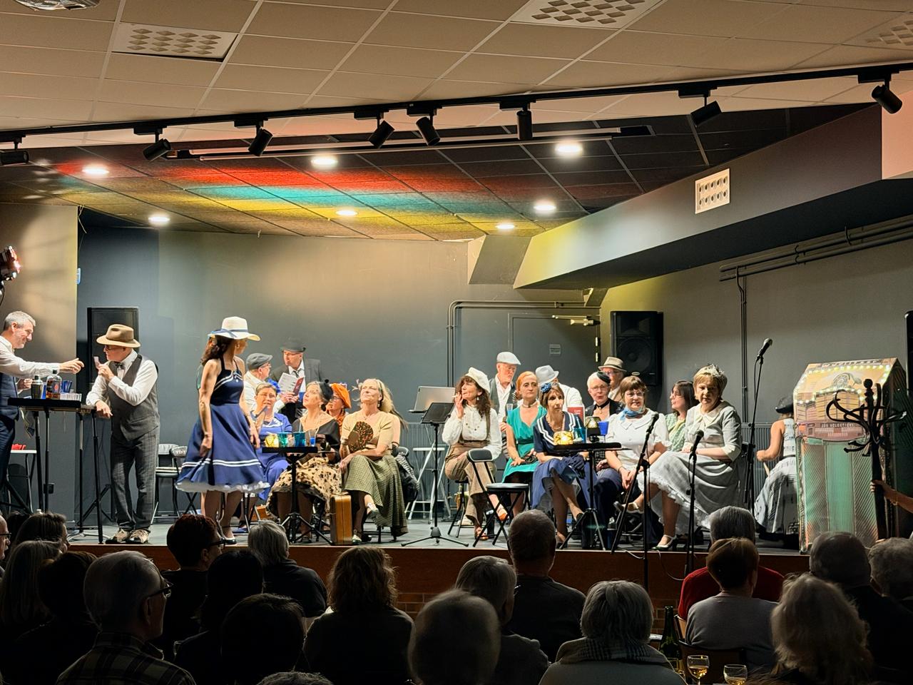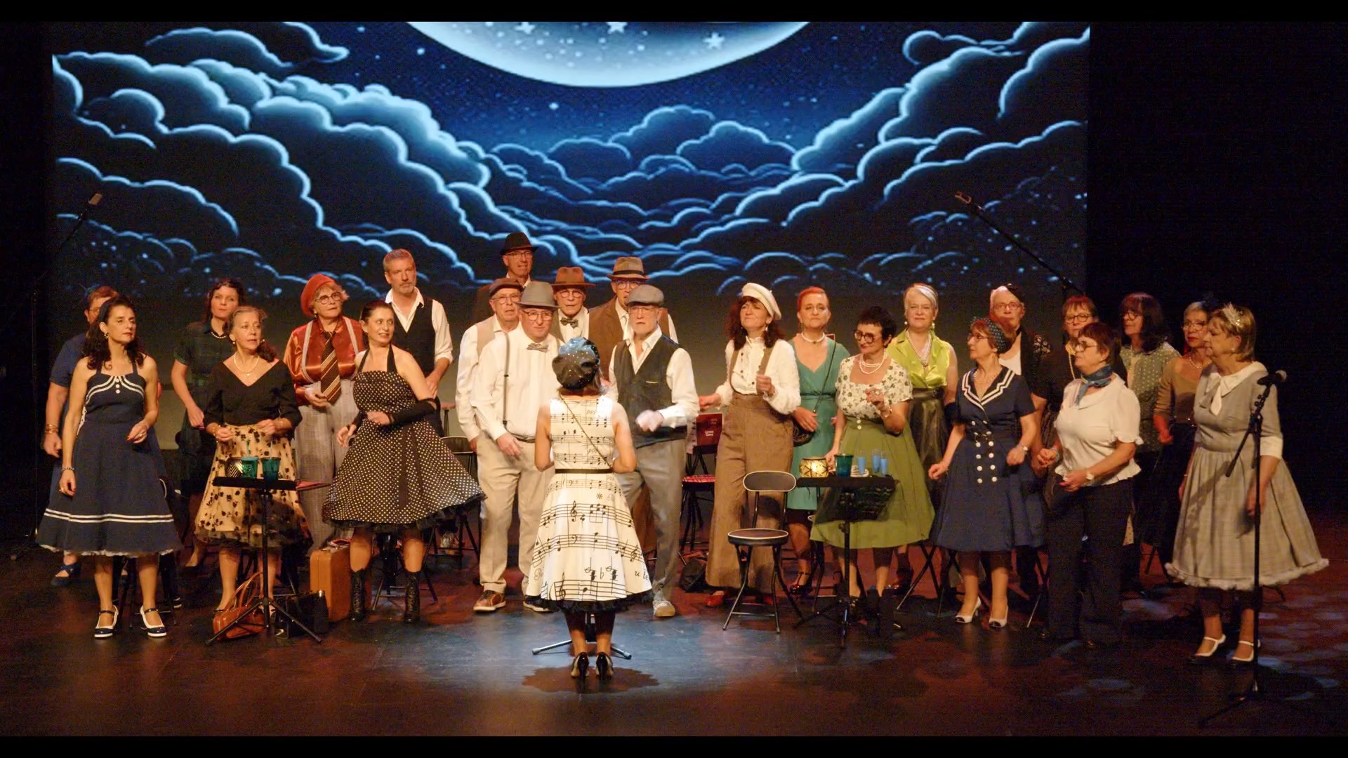 Sur scène, 26 choristes donnent vie à un répertoire vocal unique mêlant jazz vocal et chorégraphies rétro.
